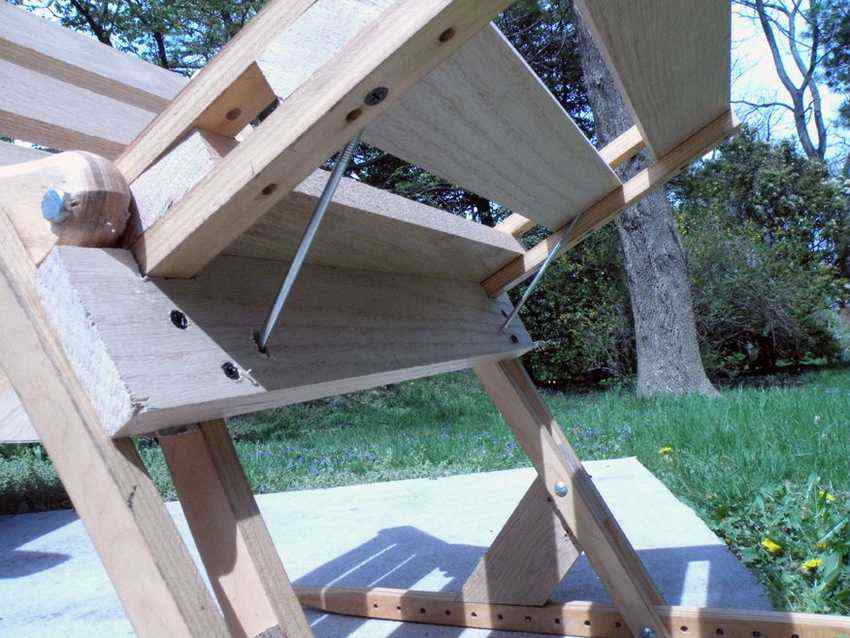 - С помощью крепежных материалов соединить торцевые верхние части ножек с перекладинами, располагающимися под сиденьем. При этом одну пару брусков установить на наружных ножках, а вторую – на внутренних.