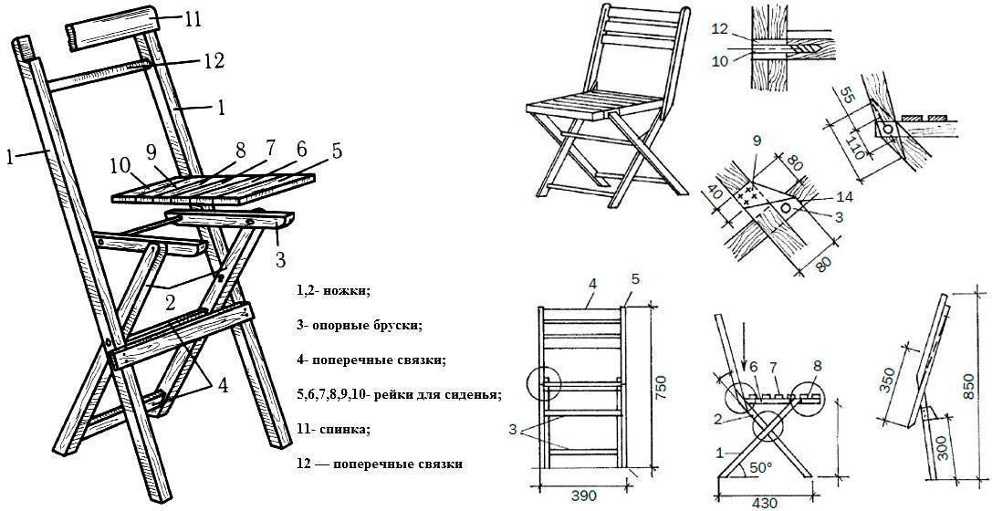 Простые стулья подходят для использования дома и за городом. Для создания складной модели потребуются короткие и длинные ножки, поперечины, деревянные рейки под спинку, сиденье. Рабочий процесс осуществляется по инструкции: