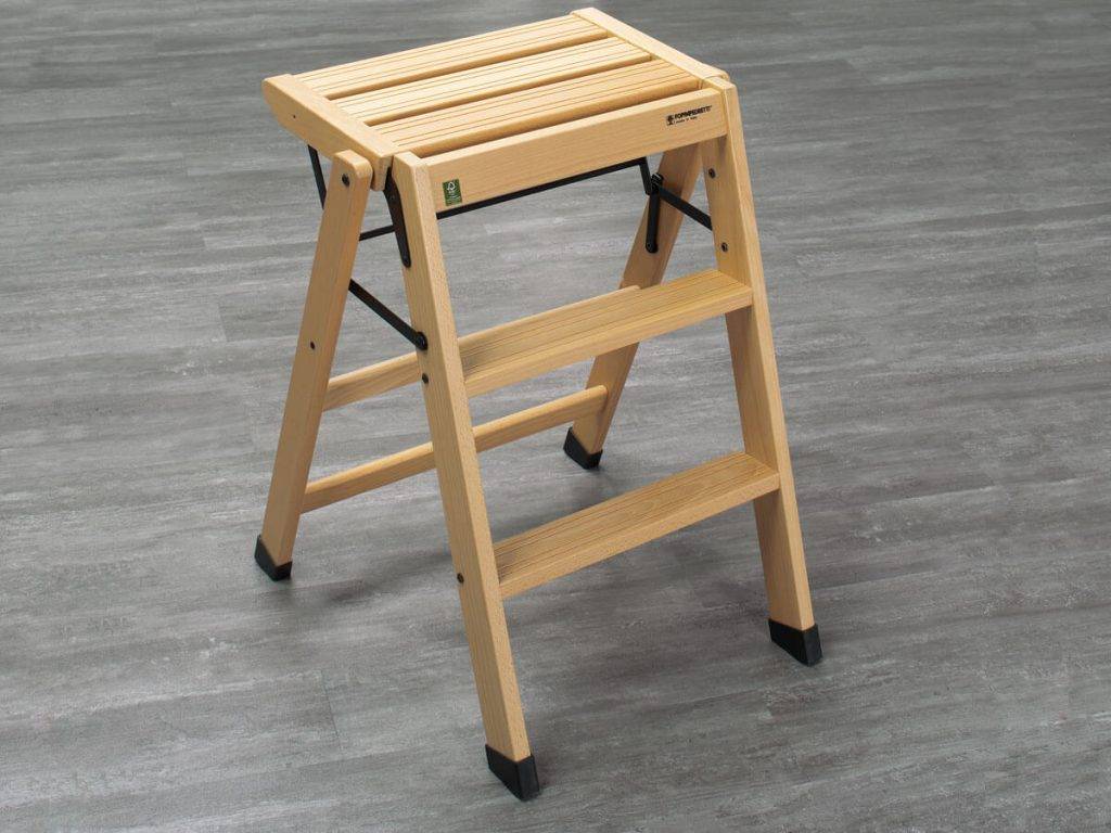 - Обычный стул-стремянка — внешне довольно неказист и занимает много места. Чаще всего у такого изделия есть одно широкое сиденье и 2-3 ступеньки, которые можно выдвинуть или сложить. Такую модель можно использовать как на кухне, так и в жилой комнате в качестве табуретки или даже тумбочки.