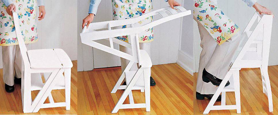 - Стул-трансформер — похож на обычный, в нижней части спрятано несколько ступенек. Такой предмет мебели можно легко превратить в стремянку.
