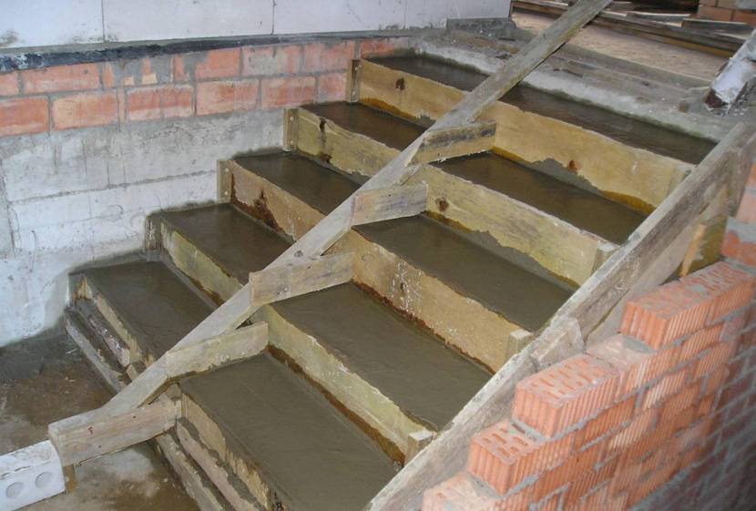 Когда опалубка выполнена, заливка ступенек происходит в несколько этапов: