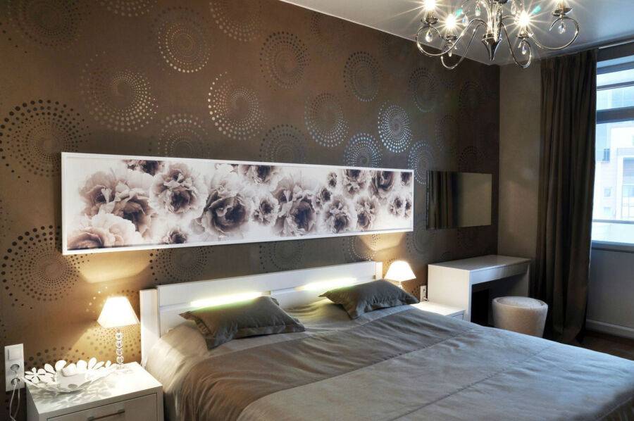 Использование коричневых обоев в спальне также является отличным решением. Это оправдано не только с точки зрения дизайна