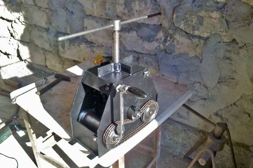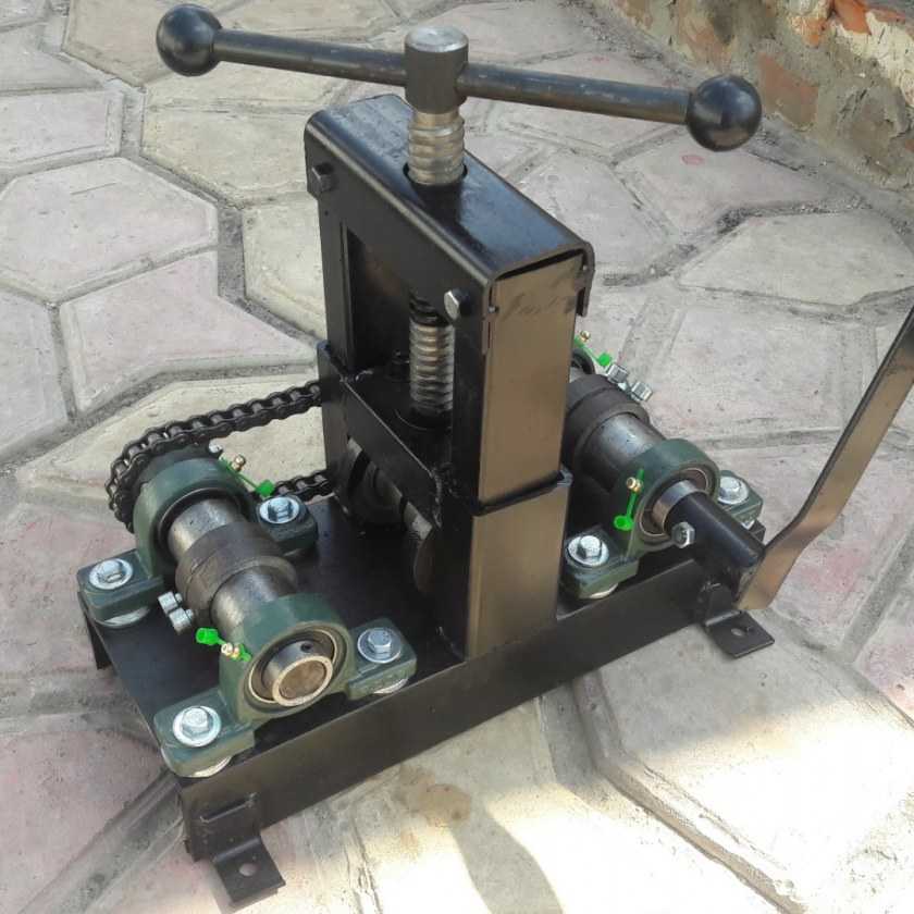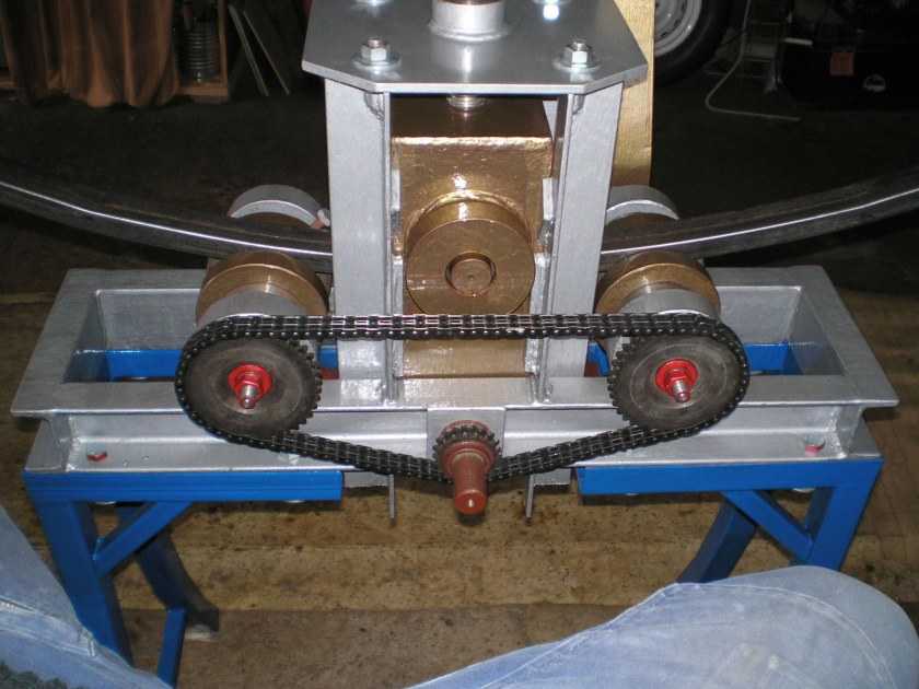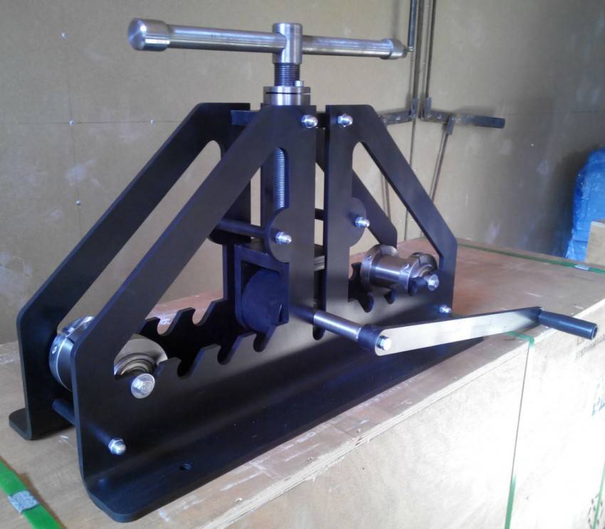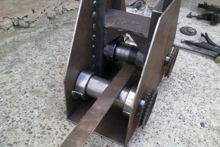 На широком основании монтируются упорные ролики на расстоянии минимум 400-600 мм друг от друга. На узком основании собирается один ролик, вращаемый рычагом достаточной длины. Затем конструкция вставляется в тиски, между роликами помещается труба и затягивается. Вращая рукоять рычага, трубу или профиль протягивают через роликовые вальцы.