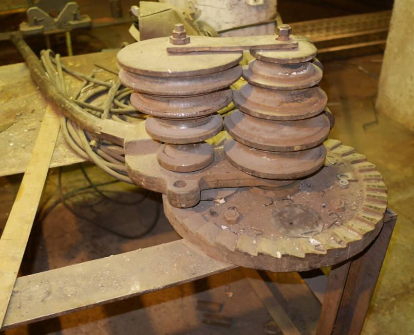 Механизм такого трубогиба предельно прост. Круглая труба вставляется между упором и первым шкивом. Кронштейн одним из краёв касается упора, и труба получается зажатой между двух шкивов. Поворачивая кронштейн рычагом, мастер оказывает давление на конец трубы и постепенно второй шкив описывает окружность вокруг первого, неподвижного. Зажатая между ними труба искривляется по радиусу неподвижного шкива.