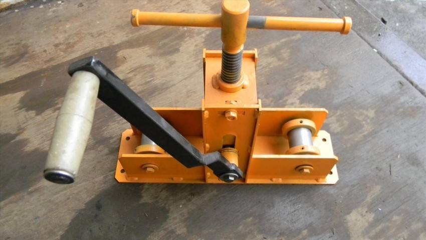 Ключевой особенностью этого трубогиба являются ролики, которые либо обжимают трубу, прокатываясь по ней, либо сдавливают её с разных сторон. В зависимости от поперечного сечения роликов устройство будет заточено под круглую либо профильную трубу.