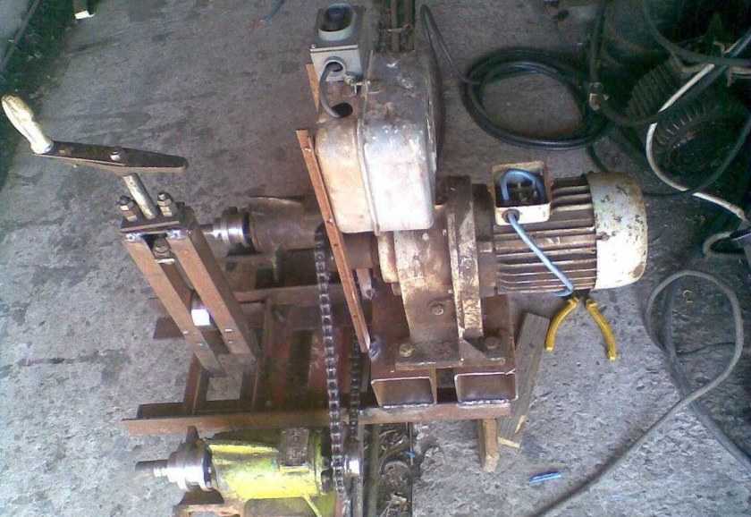 Сначала необходимо на станину инструмента установить подающий вал, на торце которого закрепить шкив. С помощью ременной передачи он соединяется с ротором двигателя. На втором торце следует зафиксировать ведущую звездочку для осуществления передачи с помощью цепи.