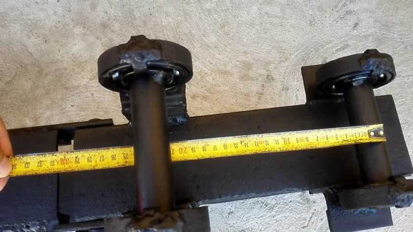 Для изготовления основы лучше всего взять профильную прямоугольную толстостенную трубу (толщина 3-4 мм) или соответственный угольник. На расстоянии 3 см от торца, необходимо насквозь сделать отверстие, сечение которого совпадало бы с диаметром вставляемой в него оси. Лучше всего монтаж начинать с установки управляющего рычага, вместе со шкивом, и стационарного шкива.
