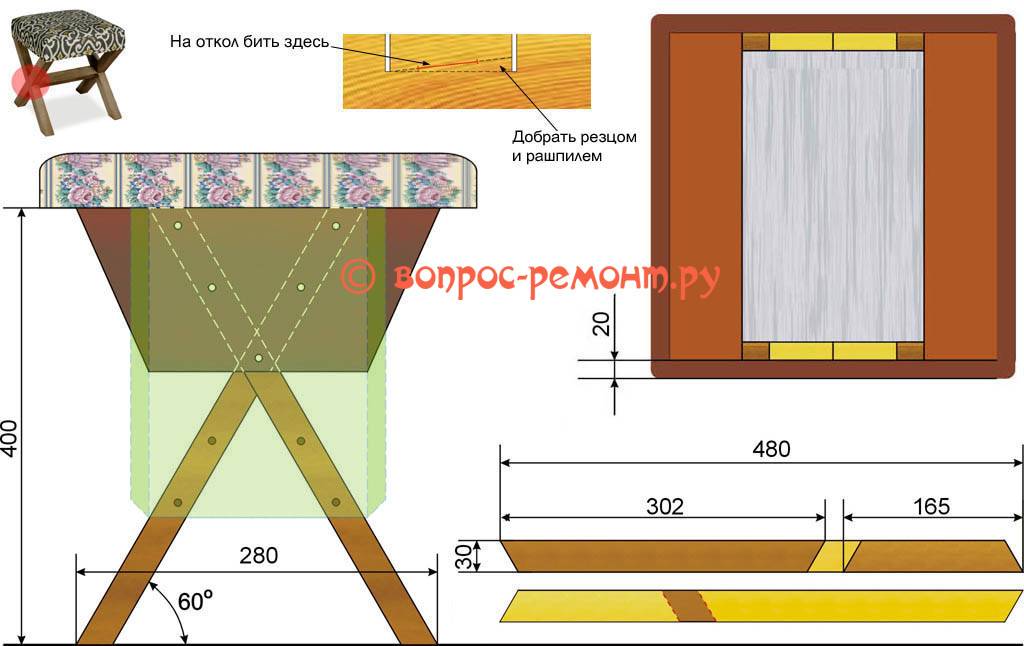 Табуретка-разножка, на 2-х парах Х-образных ножек, также довольно популярна благодаря ее небольшой материалоемкости и неплохим декоративным качествам. Однако на поверку и она оказывается не такой уж простой.