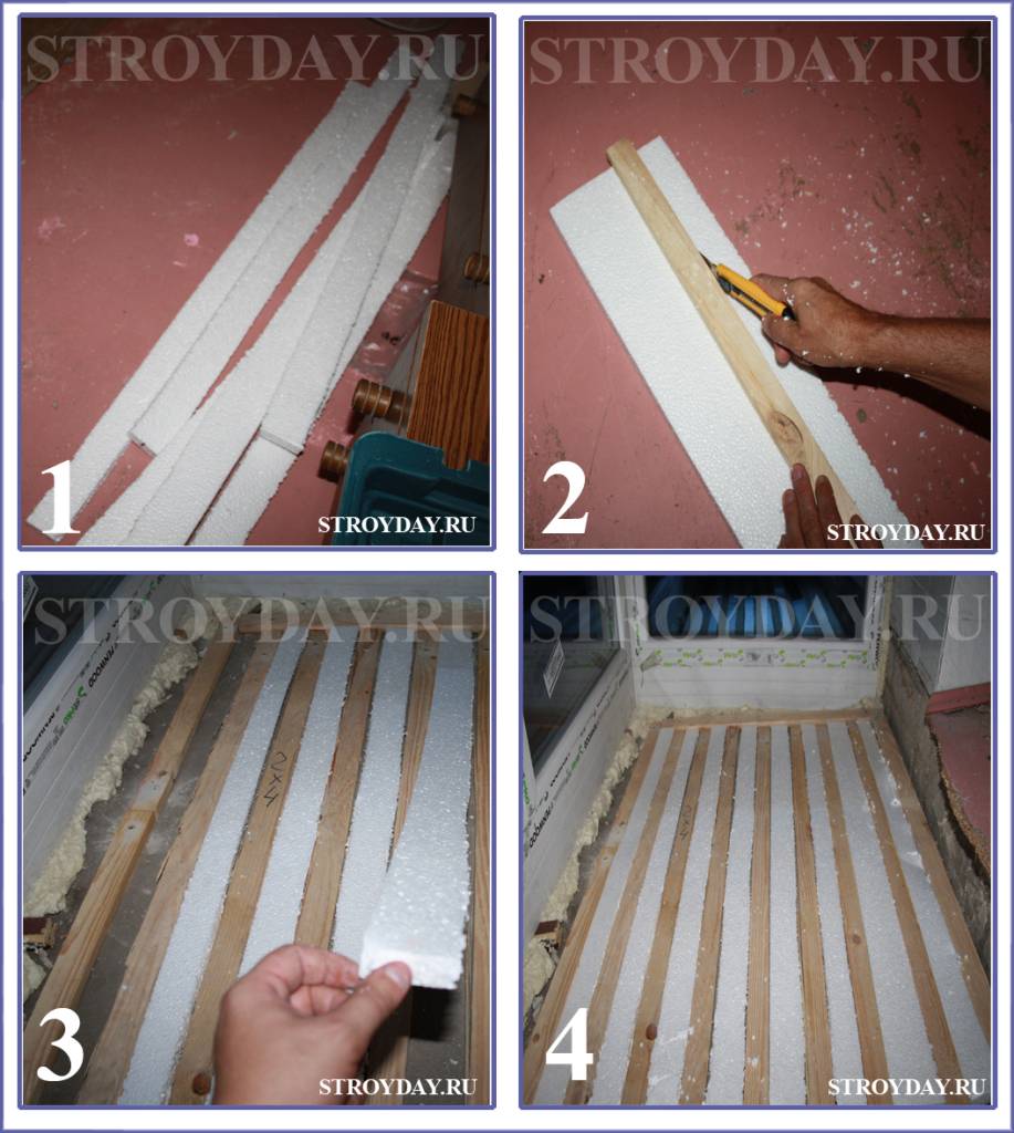 - Порезанный пенопласт укладываем в расстояние между деревянными рейками.