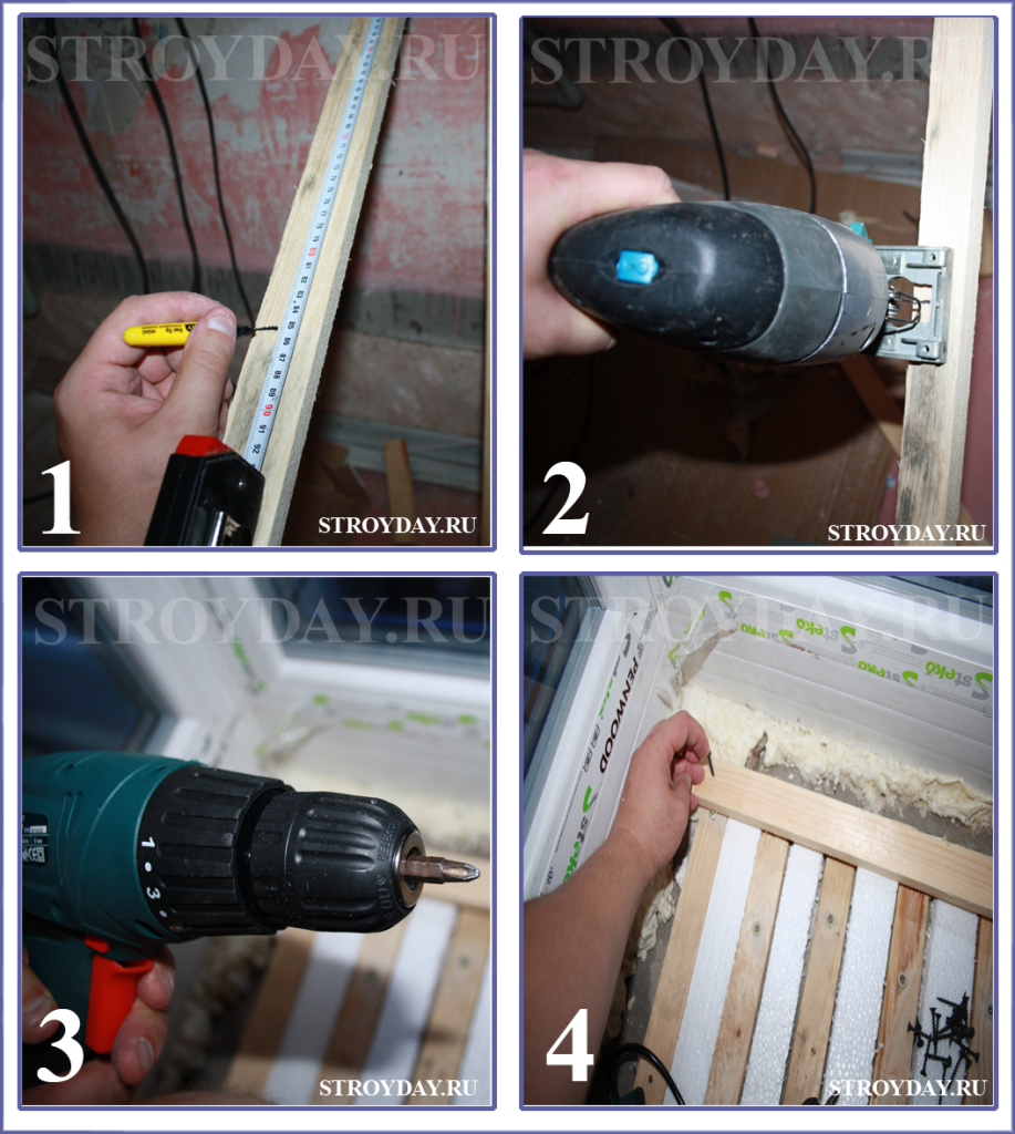 Следующая рейка, которую мы будем крепить в длину, является частью опалубки. Ее необходимо закрепить немного «внахлест», то есть с выступом ближе к балконной раме. Крепится она на саморезы.