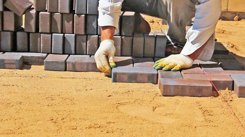 Чтобы не топтаться по утрамбованному песку, изделия укладывают в направлении от себя. Мастер, находясь на уже выложенной поверхности, укладывает брусчатку перед собой, немного вдавливая в песчаное основание, и по ней же продвигается вперед.