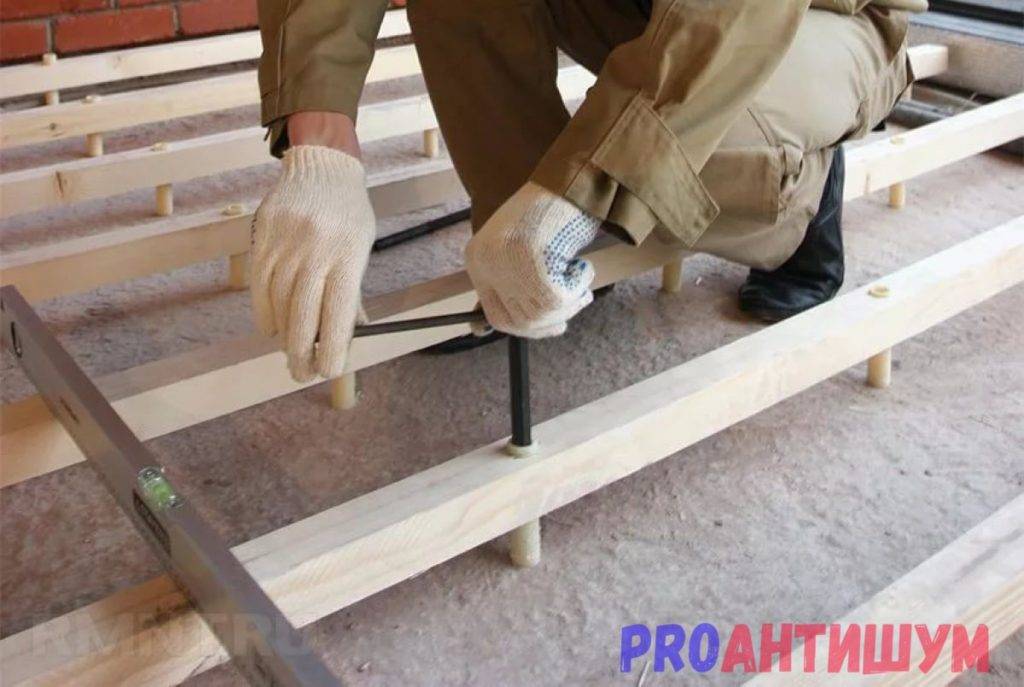 - Перпендикулярно балочным перекрытиям монтируют бруски, расстояние между ними должно быть равно ширине выбранного утеплителя.