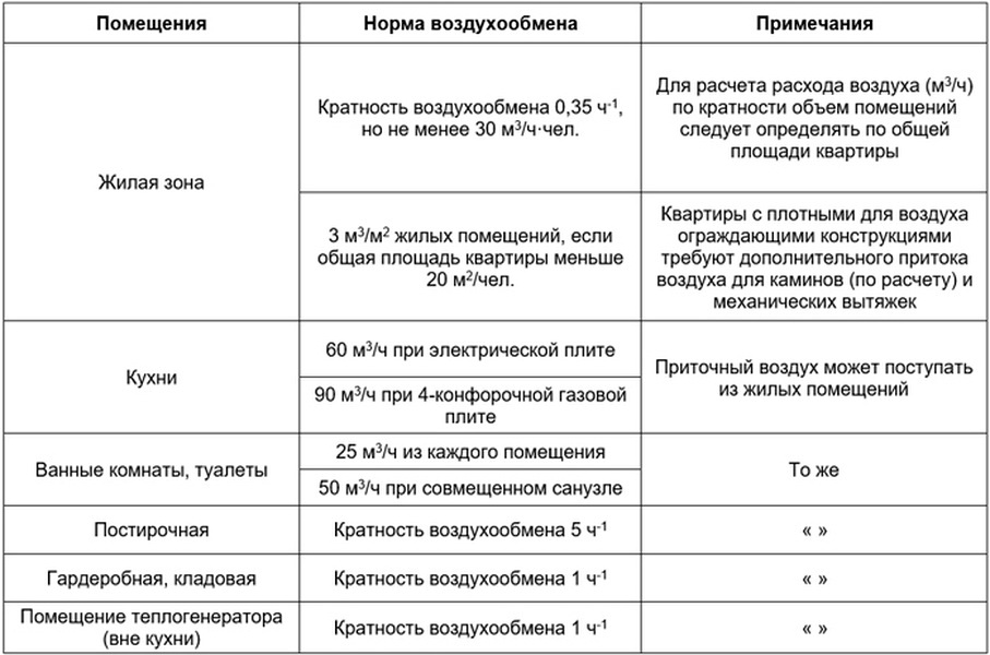 Таблица кратностей воздуха согласно СНиП
