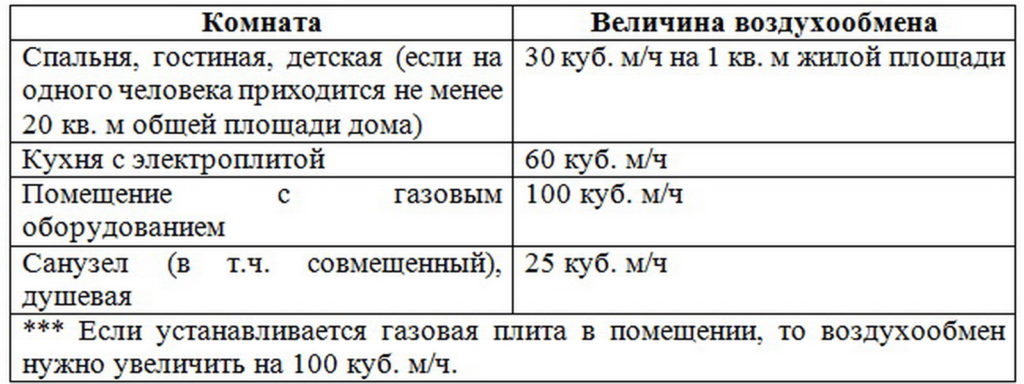 | Спальня, гостиная | 20 | 3 кубометра воздуха на 1 кв.метр жилой площади комнаты |
