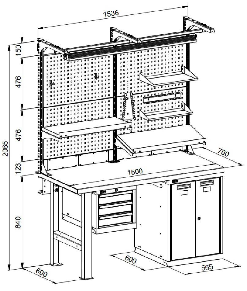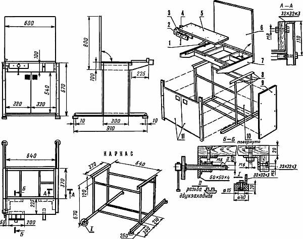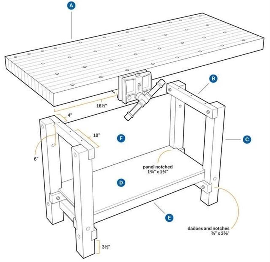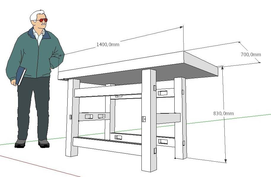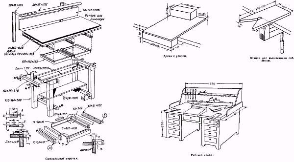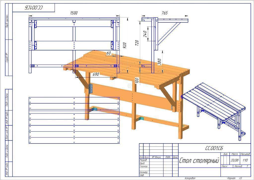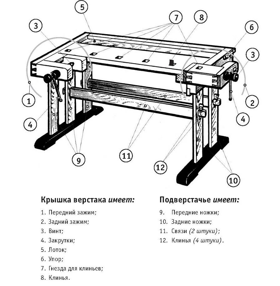 Универсальный стол имеет в своей конструкции металлическую и деревянную столешницу. На чертеже верстака изображено устройство столярной рабочей зоны.