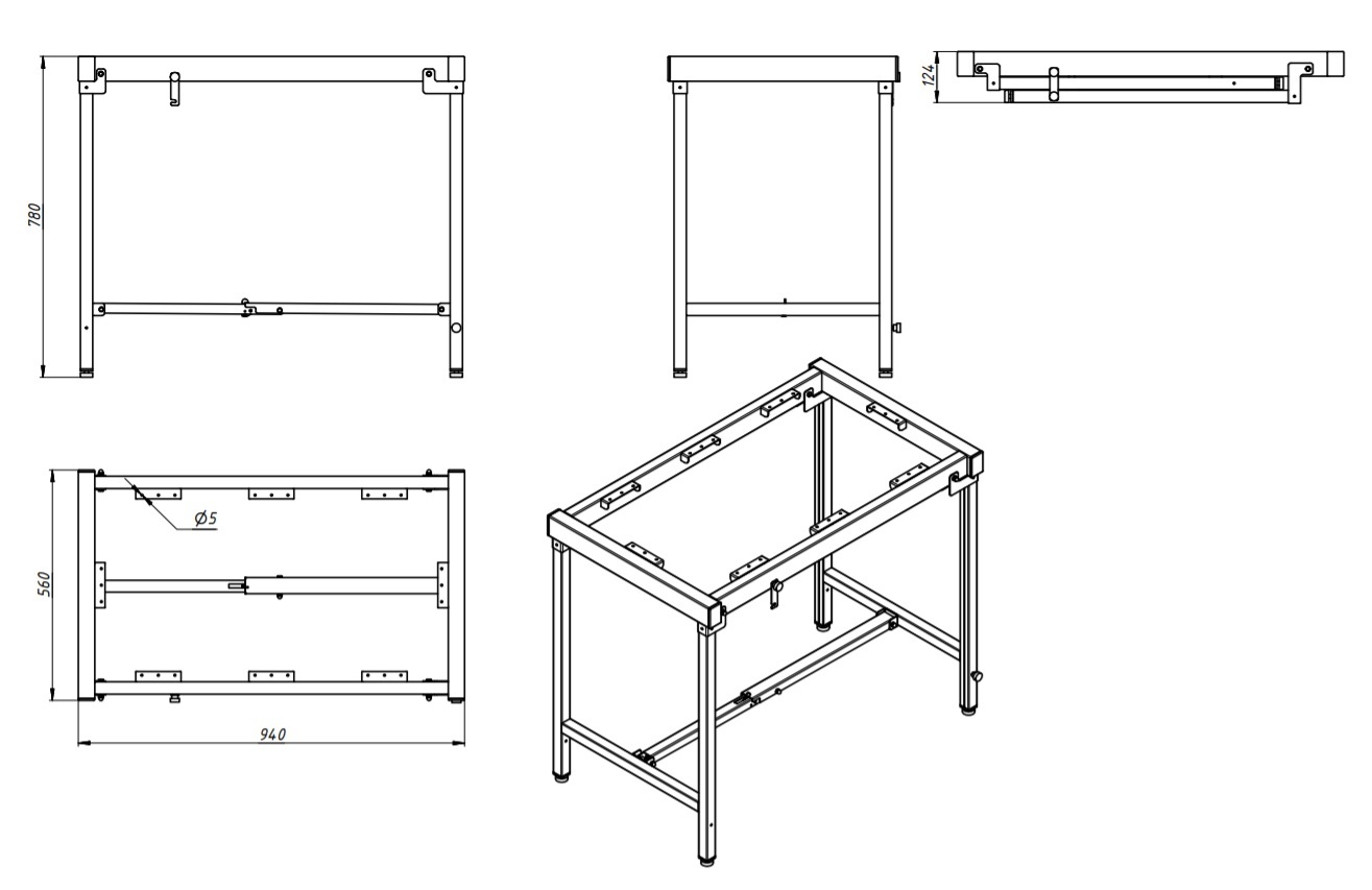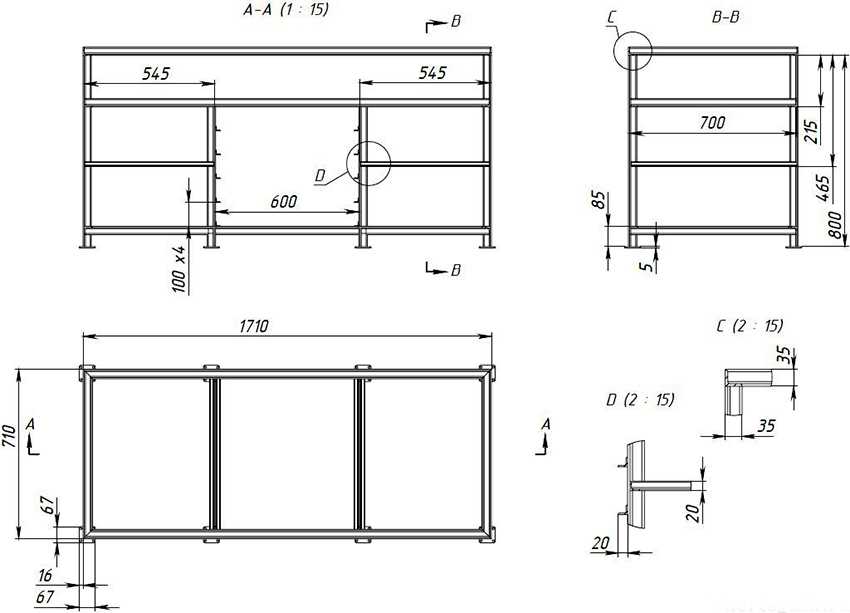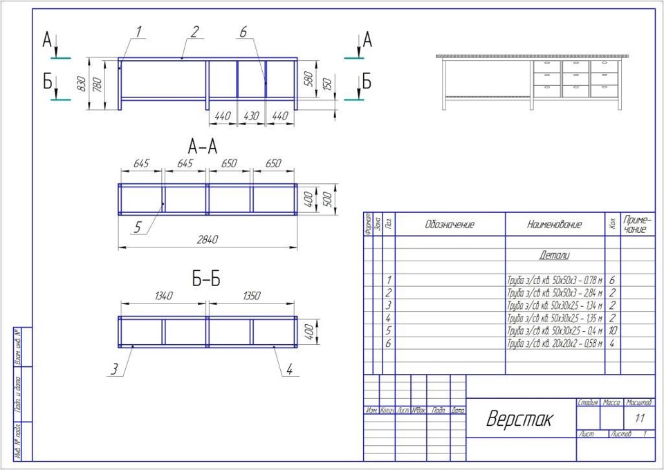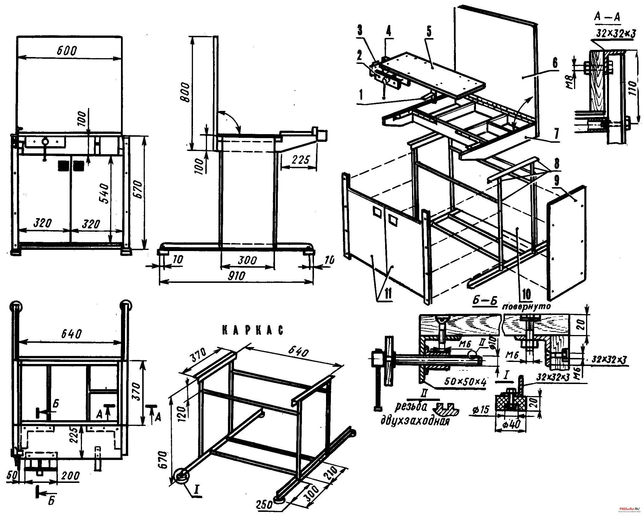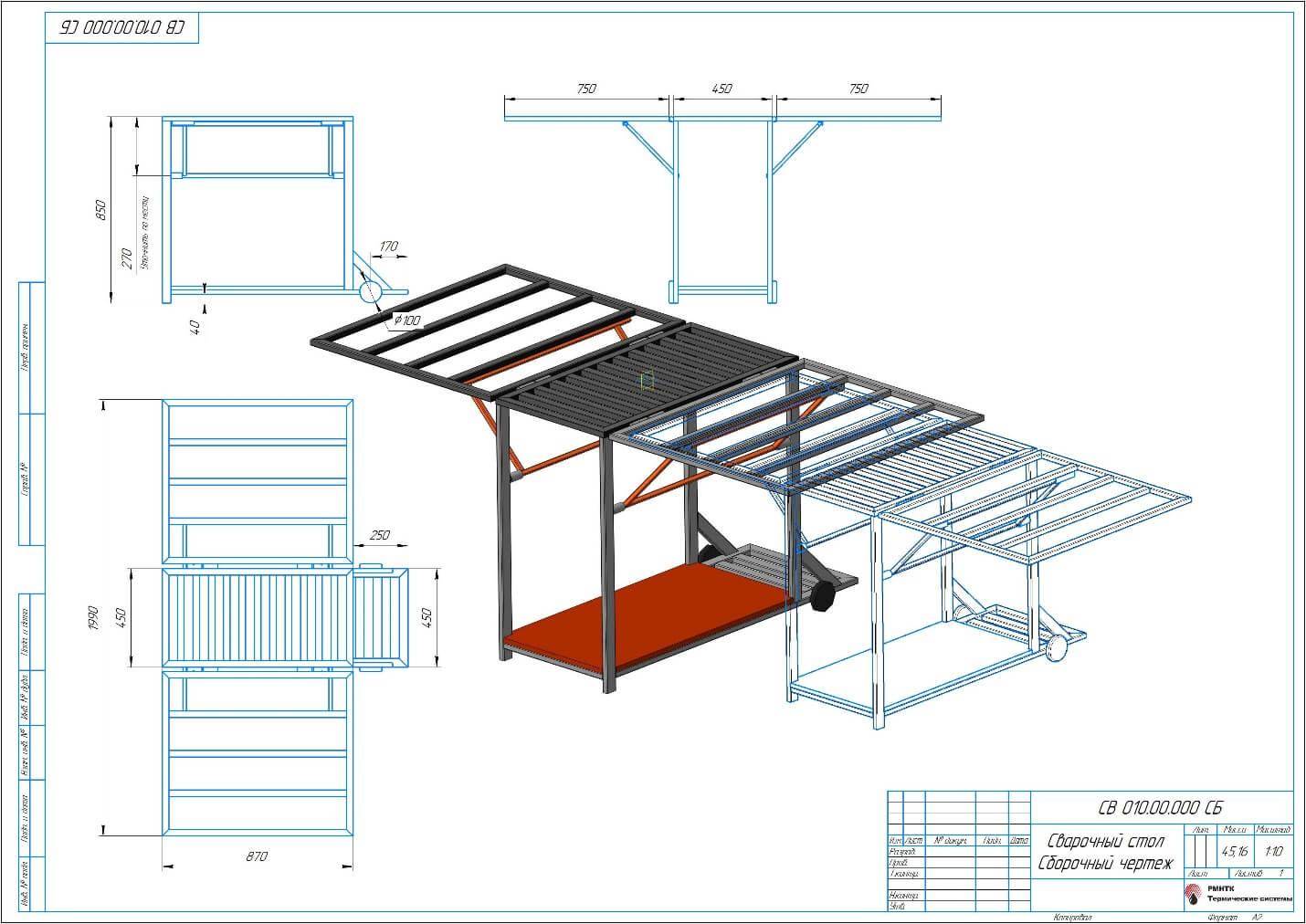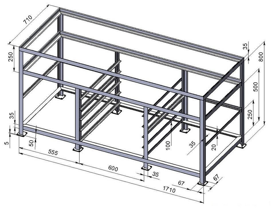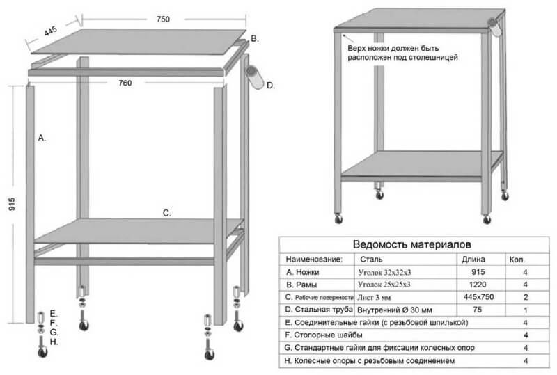 При расчете чертежей следует учитывать толщину столешницы, расстояния для креплений сваркой, длину перекатных опор, высоту оборудования. Без учета этих моментов расстояние до столешницы от пола увеличивается на 3–4 см.
