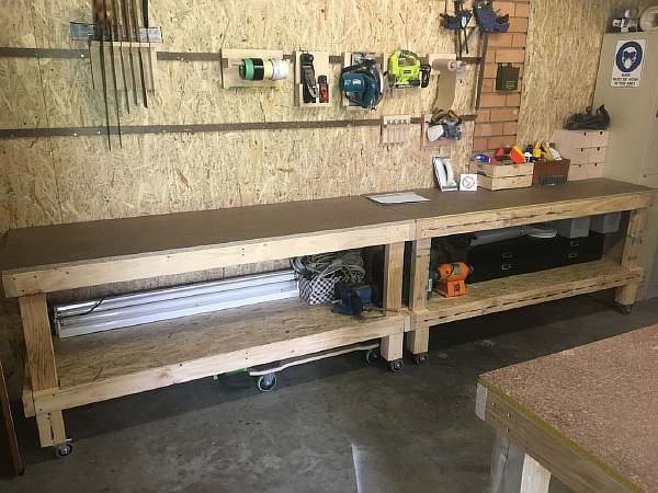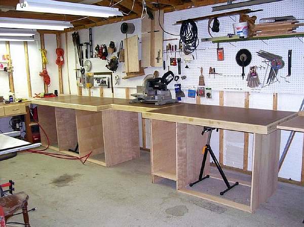 Помимо столешницы, здесь могут присутствовать многослойные конструкции полок и подвесных емкостей для хранения гвоздей, шурупов и гаек.