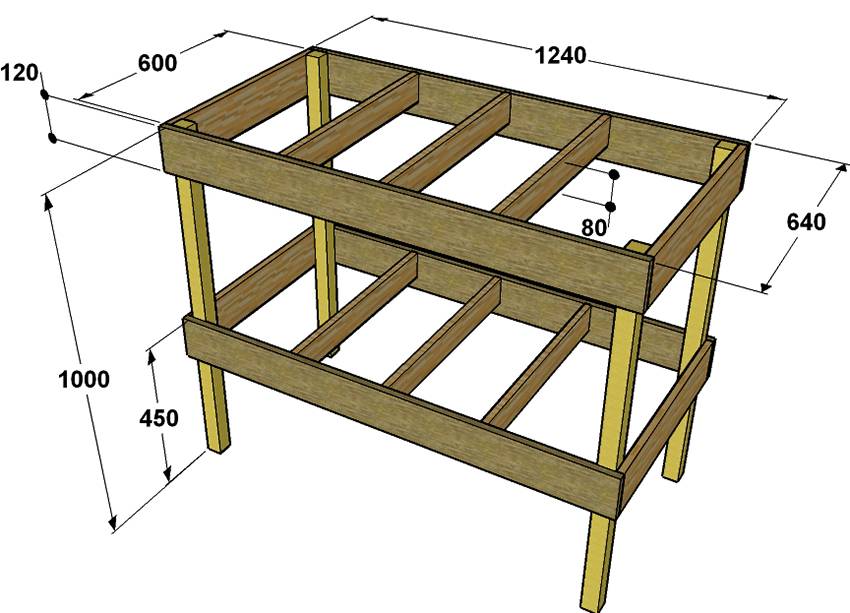 Оптимальная высота верстака в гараже рассчитывается исходя из роста человека и основного направления работ. При стационарных параметрах высоты для удобства использования изготавливают подножки в виде деревянной обрешетки.