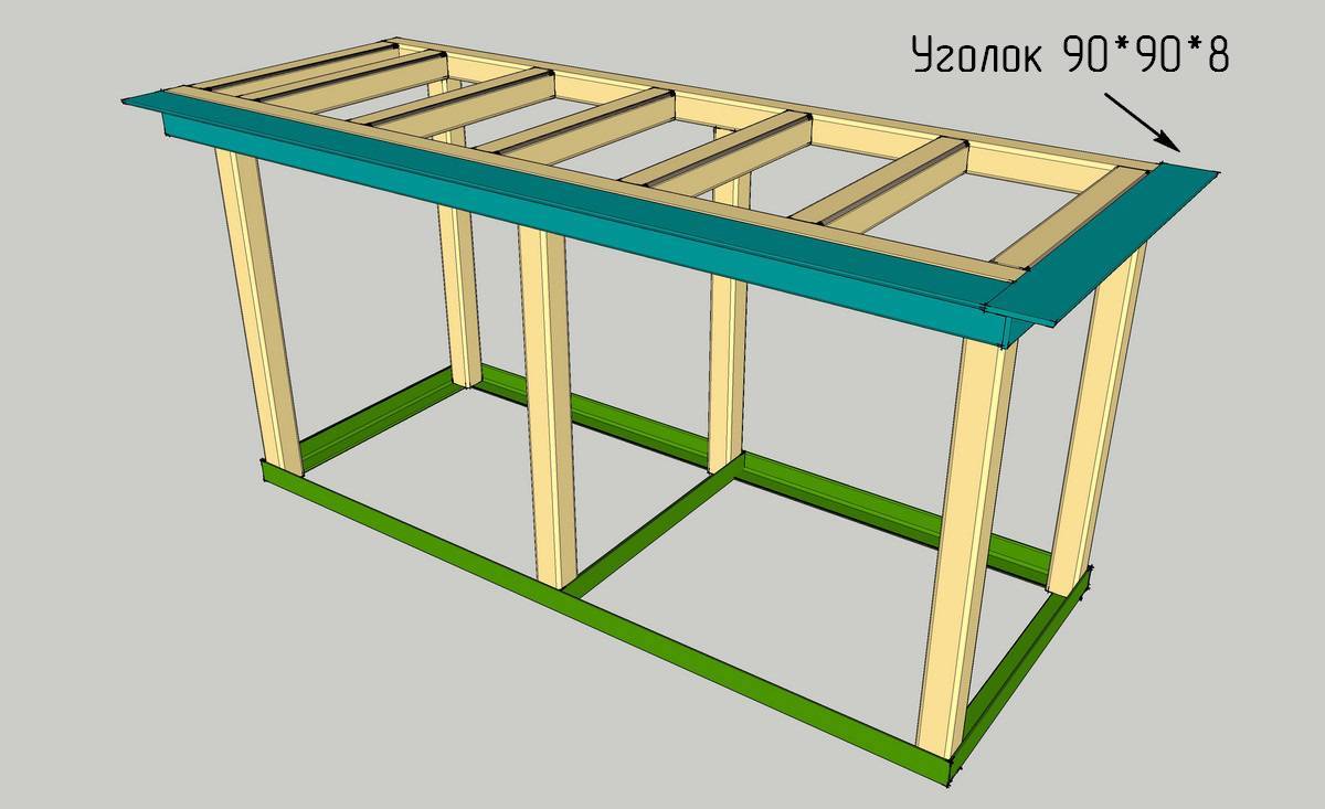 Из уголка нарезаются заготовки необходимой длины и затем с помощью сварки соединяются. Опорные пластины, прикрепленные к ножкам, способны сделать конструкцию достаточно устойчивой.