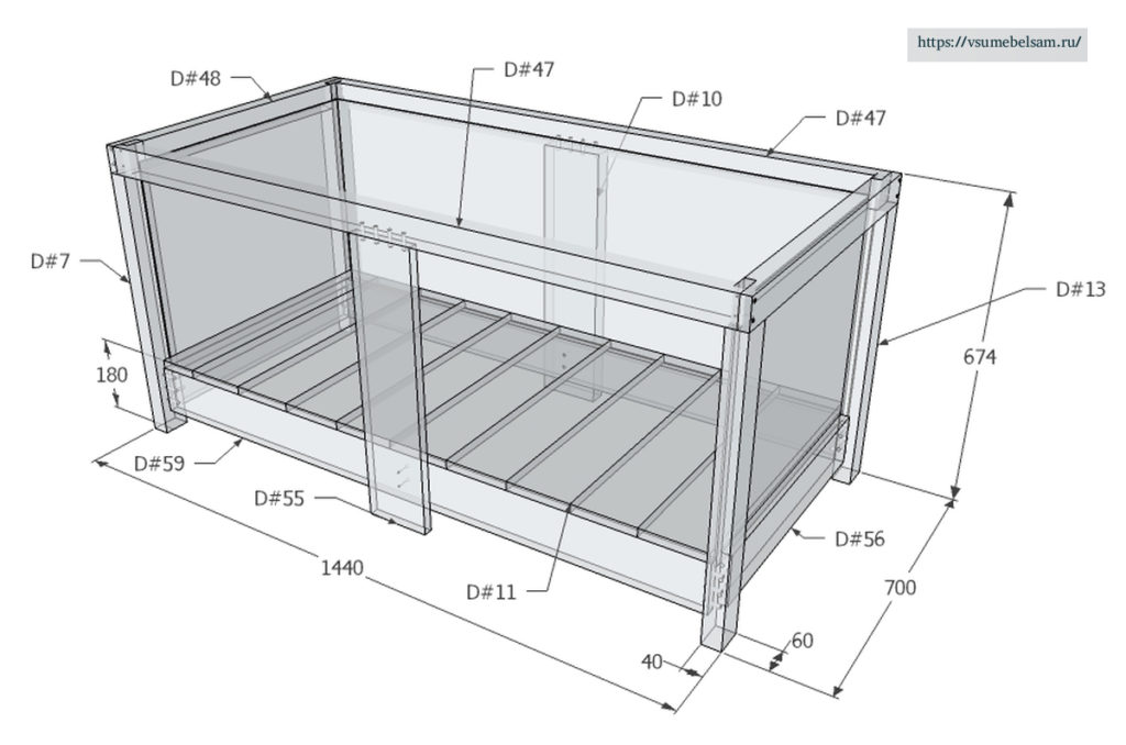 Для придания жесткости изделию необходимо сделать нижнюю полку. В нижней части каждой ножки отмечают по 25 см. Далее здесь крепят длинные деревянные планки. В дальнейшем на их поверхности зафиксируют ДСП панель. Она будет выступать в качестве основания.