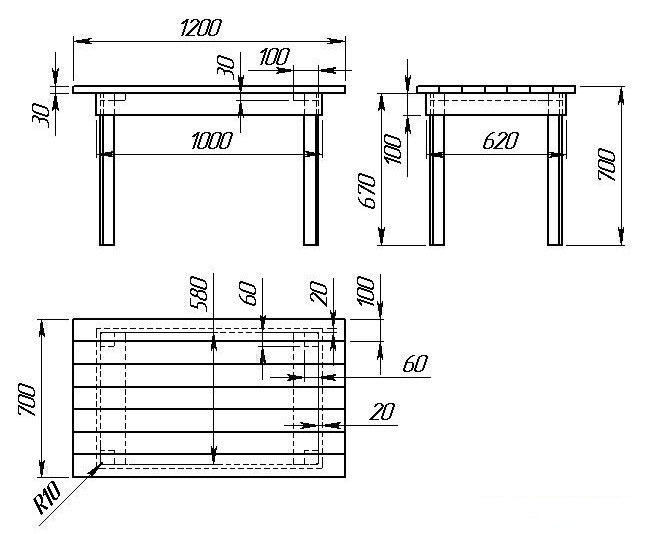 Нагрузочная способность в данном случае даже меньше, чем у предыдущей модели, поскольку для столешницы использован лист толщиной всего 3 мм, такую же толщину имеет уголок ножек.