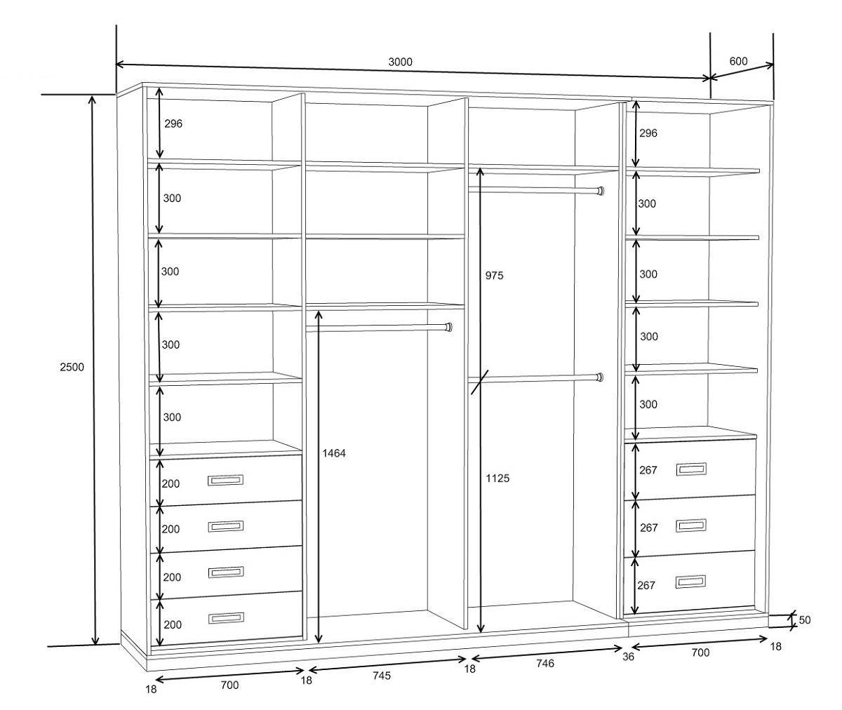 В первую очередь проводятся замеры и строится чертеж будущего шкафа. От правильно составленного чертежа зависит итоговый результат, поэтому подойдите к нему со всей серьезностью.