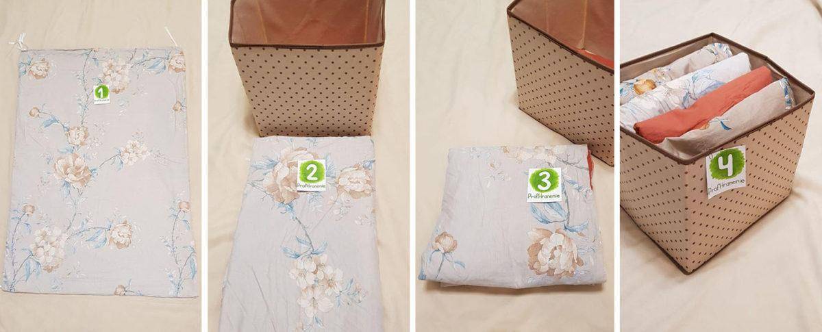 Этот способ хранения постельного белья хорош своей аккуратностью и простотой. Однако есть и минус – на белье образуются заломы, так что на кровати выглаженные простыни и пододеяльники выглядит уже не очень опрятно.