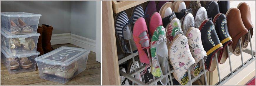 - Обувь. Определите для нее специальное место или отдельный шкафчик. Кожаную обувь лучше всего хранить в коробках. Чтобы найти потом нужную пару обуви было быстрее, распределите обувь по коробкам и наклейте на них фотографии или стикер с описанием, оставьте каждую пару с родной упаковкой или вырежьте сбоку коробки небольшое окошко и закройте пленкой. Также удобно, учитывая частоту использования каждой пары обуви, убирать коробки на дно шкафа. Но такой способ лишь частично экономит пространство. С целью большей видимости рекомендуем использовать прозрачные пластиковые контейнеры, куда можно поместить сразу несколько пар на сезон.