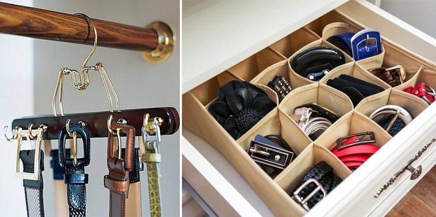 - Ремни, галстуки, шарфы, другие аксессуары. Эти предметы гардероба с прекрасной экономией пространства расположатся на дверцах шкафа. Для этого способа подойдет вешалка для полотенец, на ней можно разместить несколько крючков. Такая организация сэкономит не только пространство, но и время выбора аксессуара. Мелкие предметы советуем сложить в небольшие ящики или корзины, для этого случая воспользуйтесь коробками из-под обуви.
