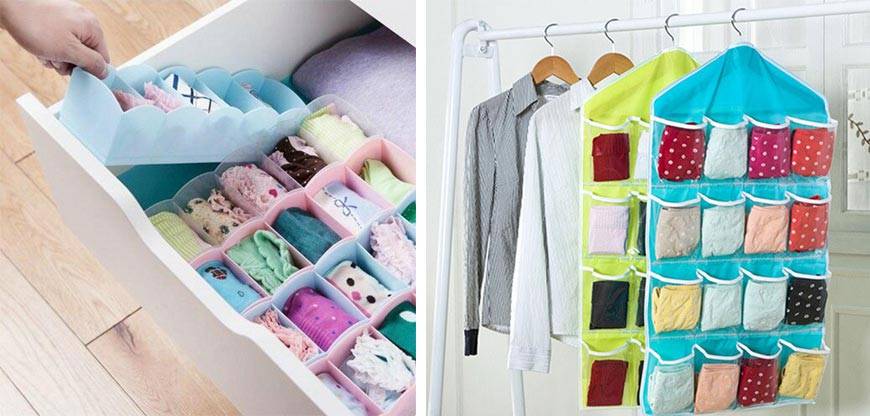 Обычное место хранения этих вещей – выдвижные ящики комода или шкафа. Соблюсти порядок и одновременно разместить максимум предметов можно если поделить пространство на секции. Для этого подойдут разделители или коробки без крышки.