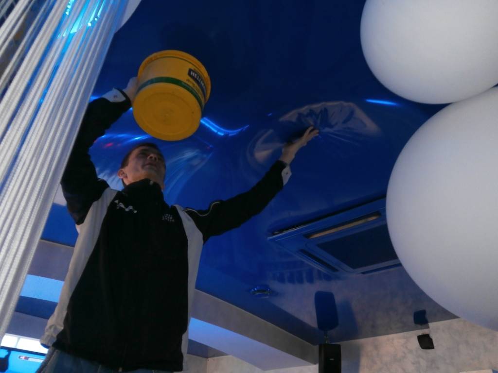 Через эту щель вводят шланг на дно с воронкой с водой и производят слив жидкости в емкость, как было описано выше. После удаления воды потолок просушивают, пленку в месте крепления к багету разогревают и заправляют на место.