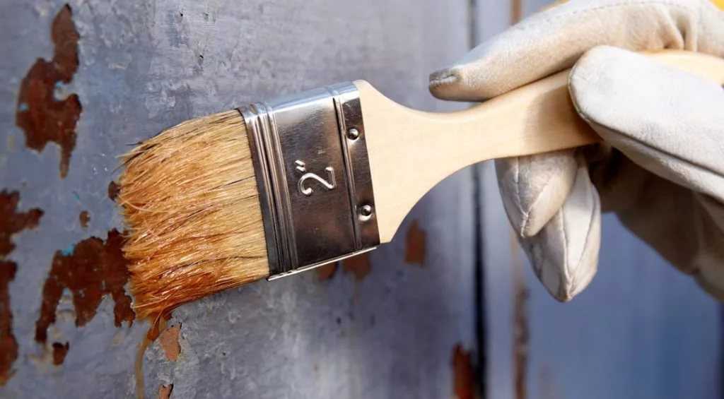 - С помощью металлической щетки удаляют верхние слои лакокрасочного состава. Для облегчения работы инструмент держат под наклоном по отношению к основанию.
