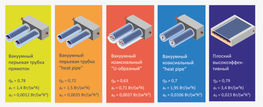 Давайте рассмотрим эффективность работы разных абсорберов, а также сравним их с плоскими коллекторами. Расчеты даны на 1 м2 панели.