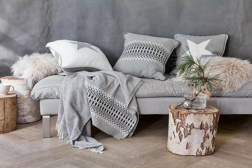 - Одеяла и подушки. Сложно представить зимние вечера без мягких тканей из натуральных материалов. Шерстяное одеяло согреет в холода и станет интересным украшением, если небрежно повесить на кресло.