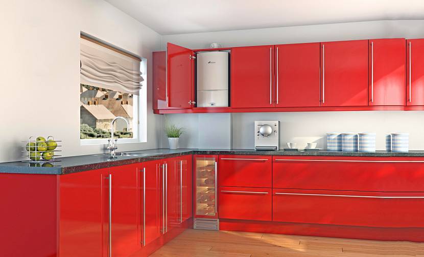 - Иногда дизайн кухни сделан настолько качественно, что сложно даже догадаться, что в одном из шкафов установлен газовый котел. Он может быть настенным с небольшими габаритами, или большим напольным.