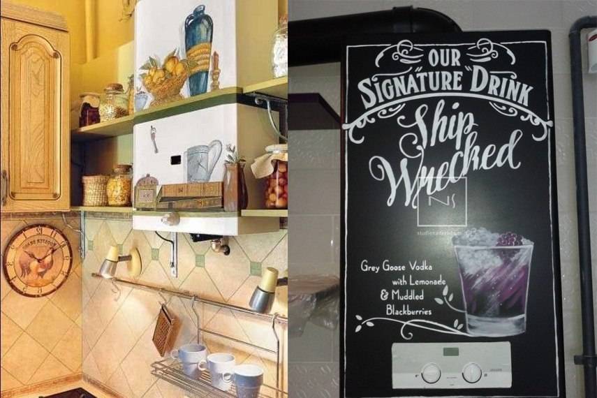 - Виниловые интерьерные стикеры, стойкие к колебаниям температур, позволят без особых усилий украсить газовый котел, придав ему своеобразную изюминку. Для кухни в деревенском или этно-стиле можно подобрать подходящие стикеры с изображением кухонной утвари, фруктов и овощей. Для кухни в стиле прованс – это могут подойти изображения ракушек, букетов лаванды и других цветов.