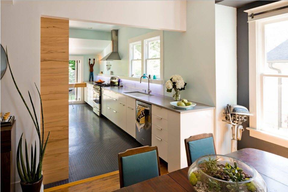 Редкий вариант, если имеется возможность устроить в коридоре дополнительное окно. Такая опция доступна лишь в строениях старого фонда, где локация коридора ограничена брандмауэрной стеной. Если устроить новый оконный проем невозможно, согласовать кухню без окна можно, если она будет выполнена в форме кухни-ниши. Под названием скрывается, по сути, вспомогательное помещение, которое не отделяется стеной или сплошной перегородкой от жилой зоны.