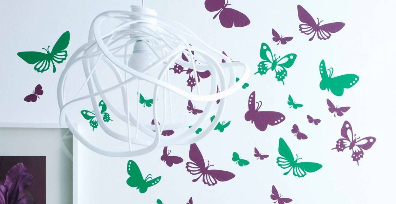 Чтобы не портить стену, можно подвесить бабочек за нитки к потолку. Рекомендуется вешать бабочек на нити разной длины. Можно использовать как цветные нити, так и прозрачную леску. Главное – нитка должна выдерживать украшения.