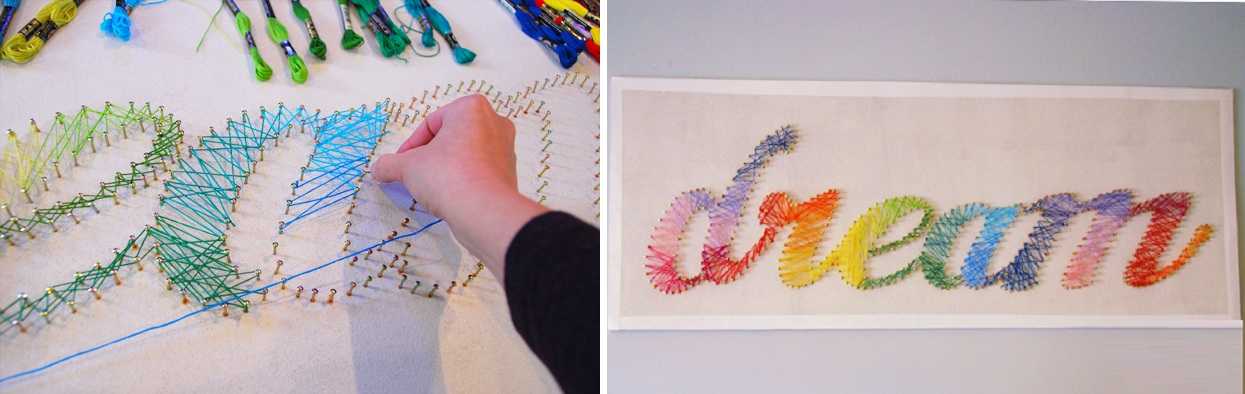 Булавки помогут поместить на стену памятные слова и цифры. Также можно расположить на холсте булавки с головками в желаемой форме и обтянуть цветными нитями.
