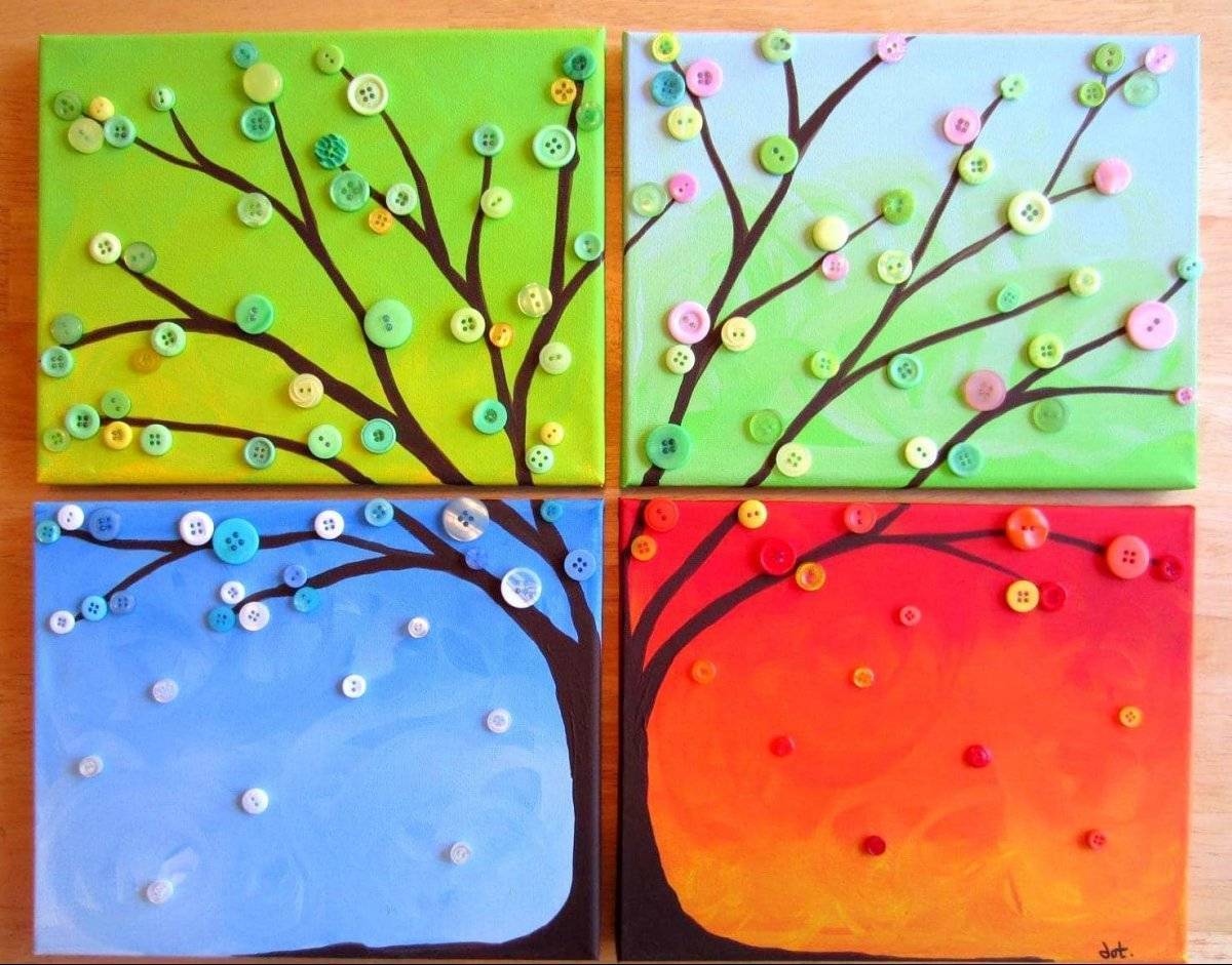 С помощью пуговиц можно изобразить на панно красочное дерево. Интересно смотрится квадриптих с изображением в разные времена года.