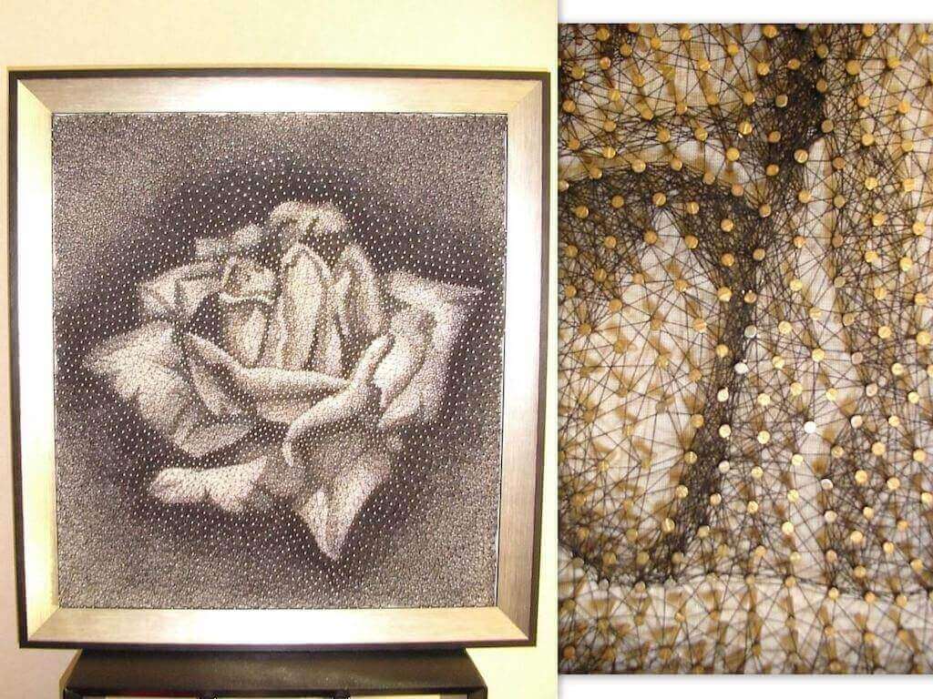 Для его изготовления своими руками потребуются аналогичные материалы. В обязательном случае делается деревянная рама, мелкие гвоздики забиваются по очертанию подложки, после — по границе выбранного рисунка.