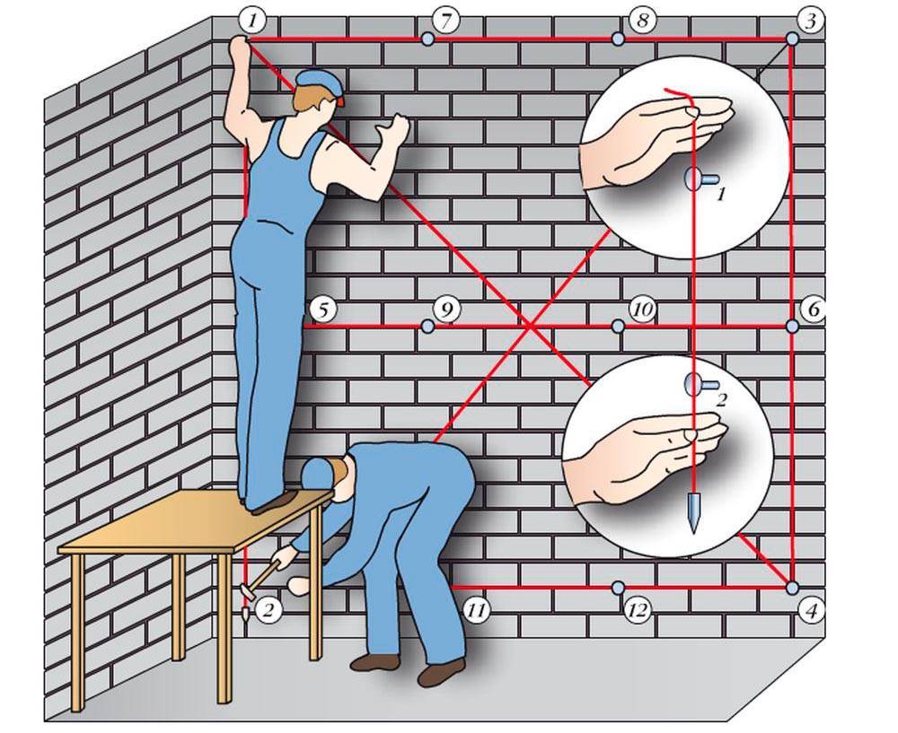 Альтернативный способ — вкрутить саморезы на одном уровне (замерить линейкой глубину вхождения), после чего натянуть между ними нити яркого цвета. Пересекаться нити должны ровно в центре. Таким образом, будет видно все перепады и провалы в стене.