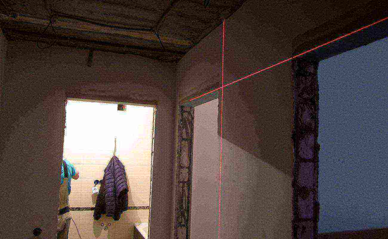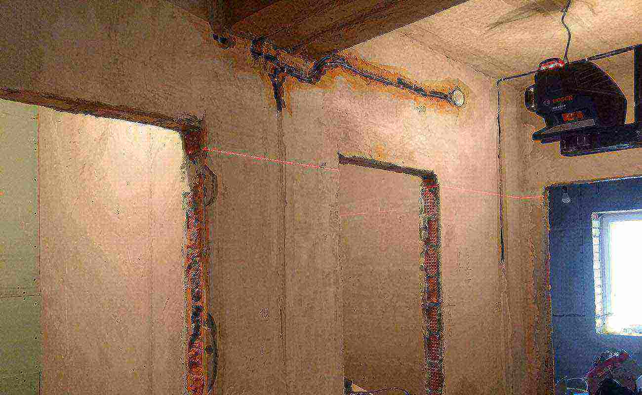 Чтобы конструкция была ровной, следует провести такую же линию и в верхней части проема. Делать это «на глаз» не стоит. Нужно начертить на стене базовую вертикаль, от которой будет откладываться отрезок в верхней части входа. Его длина должна соответствовать аналогичному параметру линии на полу. Для нанесения базовой вертикали на стене рекомендуется использовать строительный уровень и отвес. По линиям разметки выполняется монтаж выбранного материала: кладка кирпича, крепление листов ГКЛ или деревянного бруса.