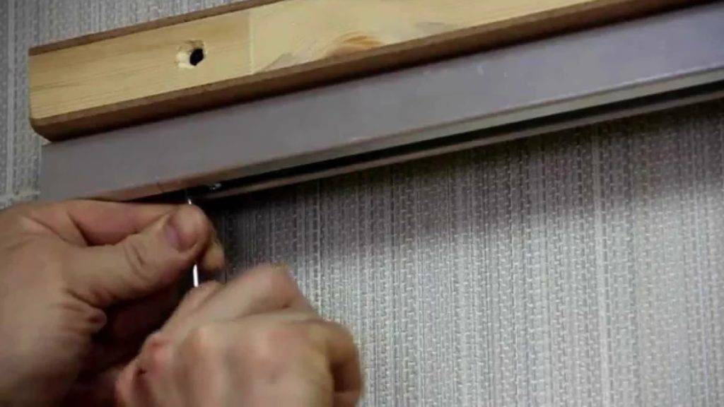 Затем переходят к верхнему уровню системы. Для этого прикладывается деревянное полотно и отмечается его верхний уровень. Саморезами брус фиксируется к стене — это место для направляющих рельс. Следом неплотно крепится нижний направляющий рельс на брус. Проверяется свобода хода изделия и при необходимости саморез вкручивается сильнее.