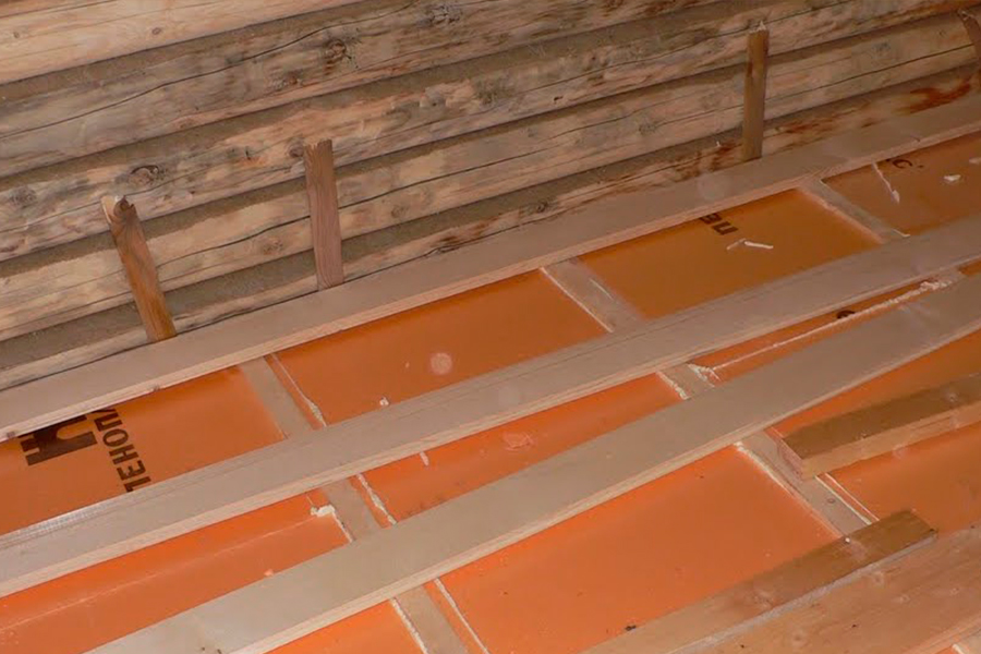 - Основа для укладки изолирующего материала делается наращиванием на балки черепных брусков.