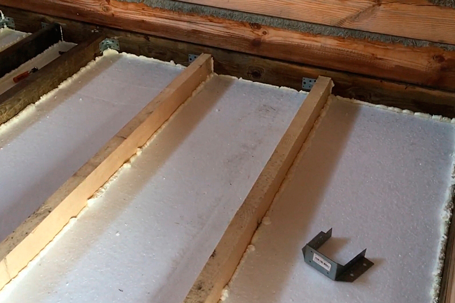 - укладку пенопласта на пароизоляционный слой в пространство между опорными балками. Утеплитель должен максимально плотно прилегать к лагам, исключая образование зазоров. Закрепляют пенопласт специальными клеящими составами. Стыки плит заклеивают армирующим скотчем;
