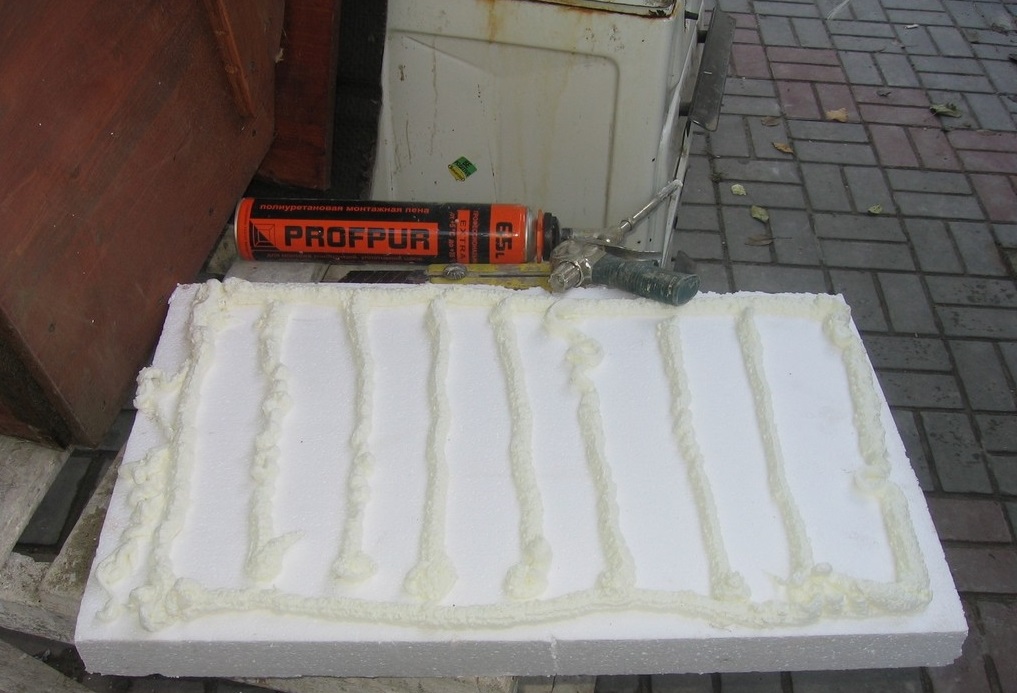 - Листы можно зафиксировать к гаражным створкам строительной пеной. Для крепления на обратную часть пенопласта она наносится по краям, лист крепится на требуемое место.