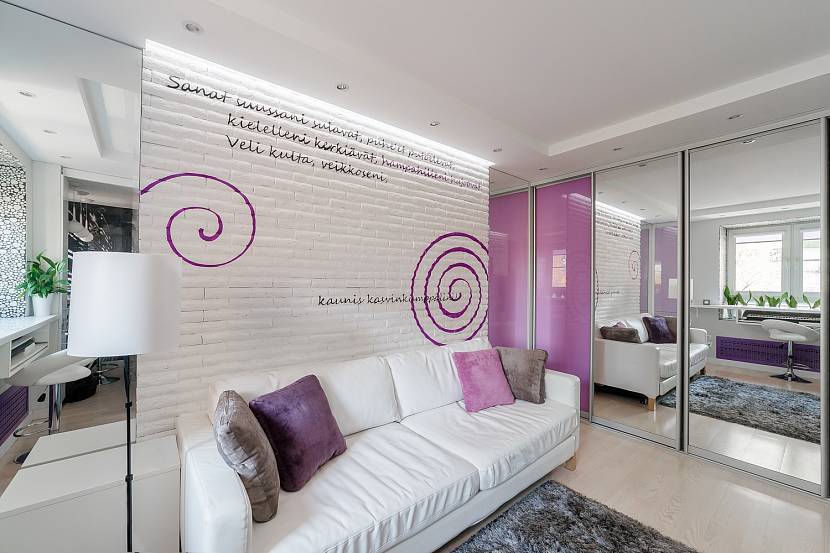 - Установка узких высоких шкафов с зеркальными фасадами создаёт эффект простора, а вертикальные яркие вставки на мебели расставят акценты.