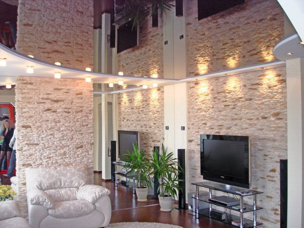 Отражающее глянцевое покрытие, монтированные в потолок светильники, светодиодная подсветка по периметру не только сыграют на увеличение пространства, но также добавят стиля и современности интерьеру. Кроме этого, двухуровневая система поможет зонировать комнату.