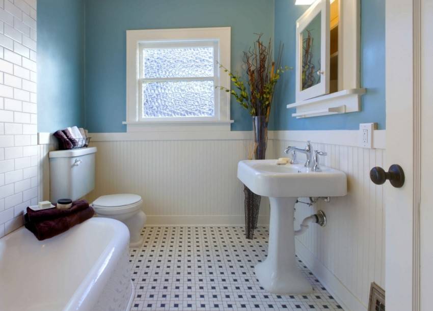 Первым делом размещают ванну и умывальник. При потребности или наличии предусмотренного места — также душевую кабину, унитаз. Только потом выбирают место под бойлер, стиральную машинку, зеркала, полочки, шкафчики, сушилки и вешалки-крючки. Технику для стирки одежды ставят в существующие стеновые или внешние ограничивающие ниши, которые предусматривают в основном для легких неустойчивых моделей. Большинство поверхностей отделывают плиткой или панелями с устойчивостью к влиянию физических процессов. На пол кладут нескользящее покрытие, матовые плиты — одно из таких.